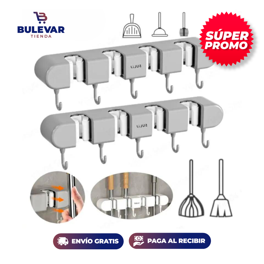 Simplifica tu vida con nuestro práctico CUELGA TODO. Ideal para colgar traperas, escobas y otros objetos en tu hogar, patio o cocina. Libera espacio y evita el desorden, es resistente, duradero y ecológico.