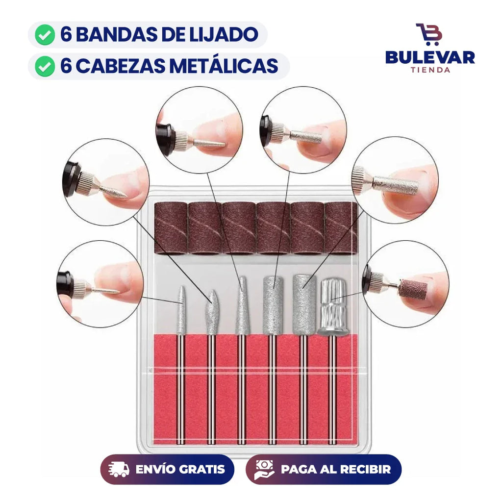 Gracias a las 6 fresas intercambiables y 6 cilindros de lija incluidos permite modelar, suavizar, esculpir, afilar, dar brillo a las uñas y eliminar durezas tanto en las manos como en los pies.