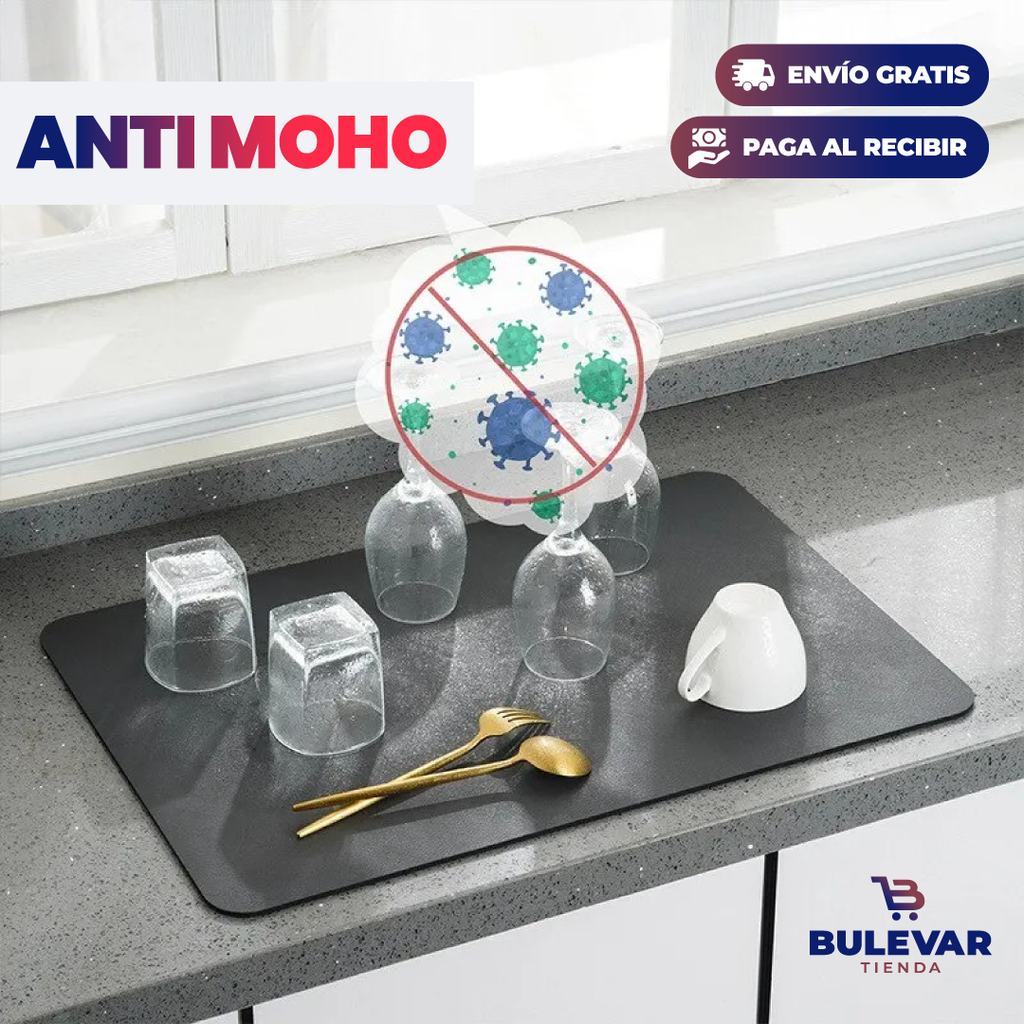 El tapete absorbe el agua antes de que se extienda por todo el mesón de cocina. Tambien se seca 3 veces más rápido; así que puedes despedirte de los paños convencionales de cocina.